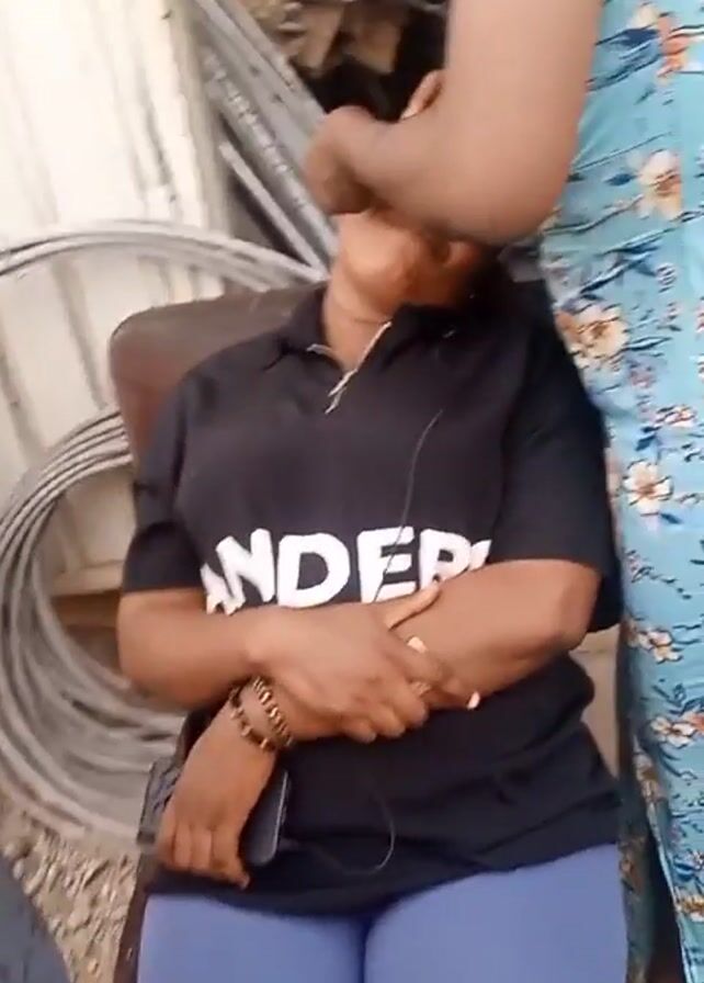 A woman wearing a black shirt with the word "ANDER" on it and blue leggings sits in a chair, while another woman wearing a blue floral dress works on her face near her eyes. The woman in the chair is smiling. There are metal coils and other metal scraps in the background, as well as a corrugated metal wall.