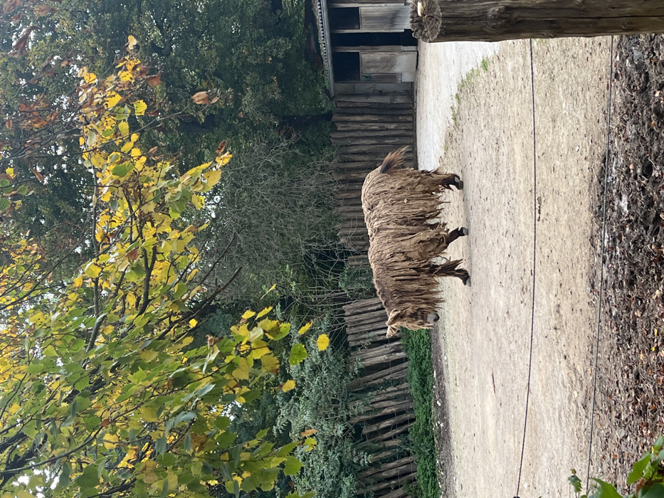 - "A single Baudet du Poitou donkey with a distinctive long, matted, shaggy brown coat walks from left to right across a light brown dirt enclosure" by FM-rLGAz2, licensed under CC BY 4.0