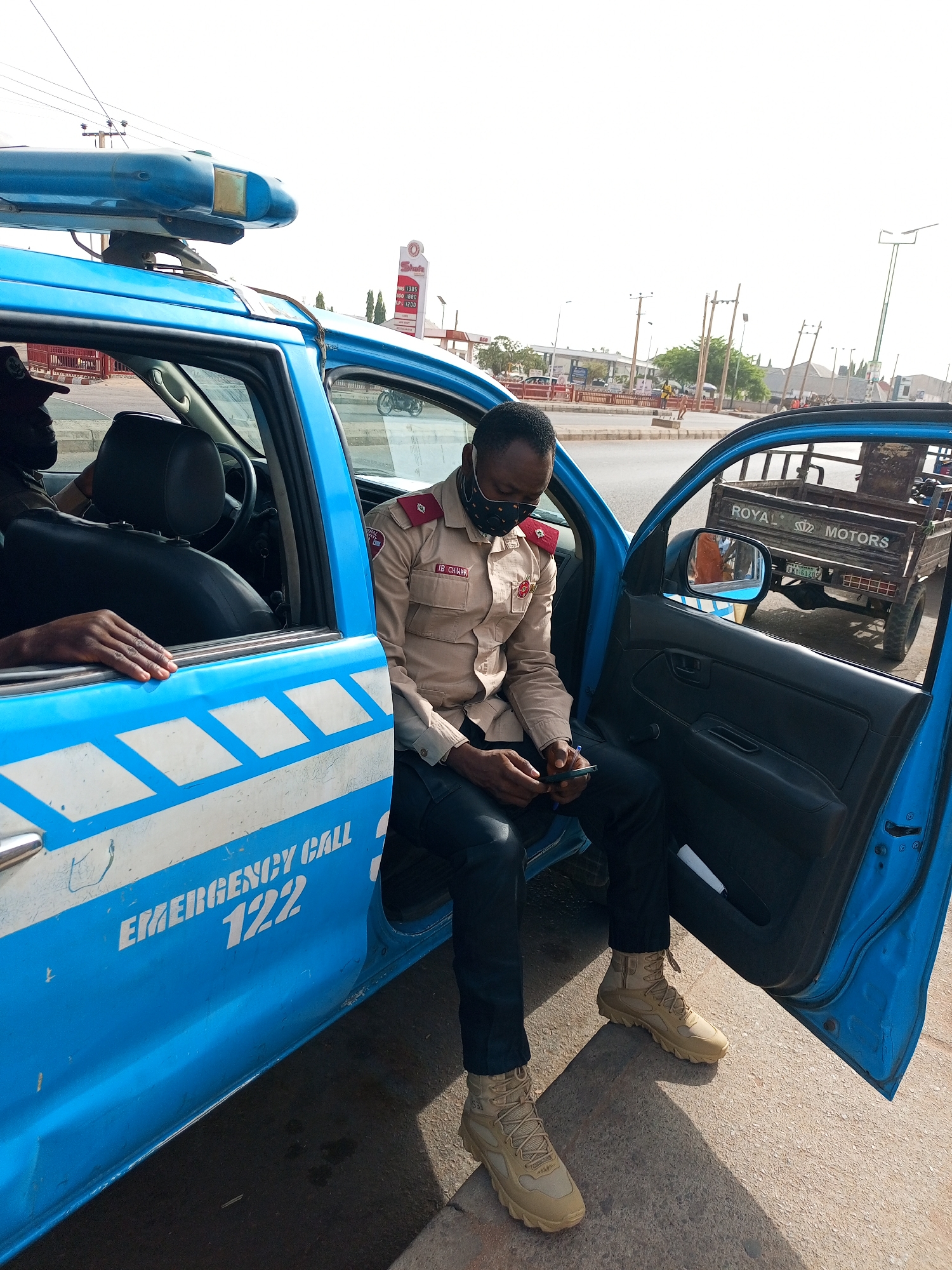 In the city of Tempure, Nigeria, an outdoor urban scene depicts a uniformed male, identified by a name tag as "IB CHIMA," seated on the threshold of the open front passenger door of a blue emergency pickup truck