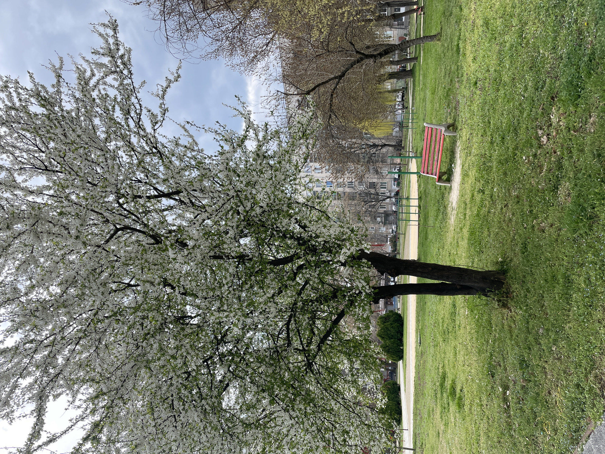 The image displays an outdoor green space in Pazardzhik, Bulgaria, under an overcast sky. A large, multi-trunked tree located in the left and central foreground is densely covered with small white blossoms and emergent green leaves. To the right of this tree, a park bench with red wooden slats and light gray concrete supports is situated on a patch of bare ground amidst a green lawn. Further into the midground and background, additional trees are visible, some with bare branches and others displaying nascent light green foliage, including a weeping willow-like tree. Behind these trees, multi-story residential buildings with numerous windows line a street where several parked vehicles are discernible. Green metal bars, possibly part of a playground or exercise area, are partially visible in the midground-left. No individuals are present.