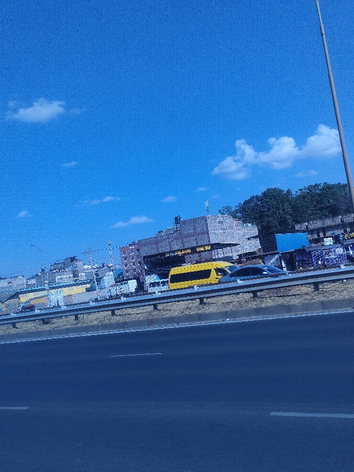 A daytime view presents an urban scene alongside a roadway. A yellow bus and a silver car are visible behind a metallic barrier. Several buildings of varying heights and constructions line the cityscape. The sky, predominantly blue, contains scattered clouds. A thin, tall pole is stationed on the right-hand side. The dark asphalt road occupies the lower portion of the image.