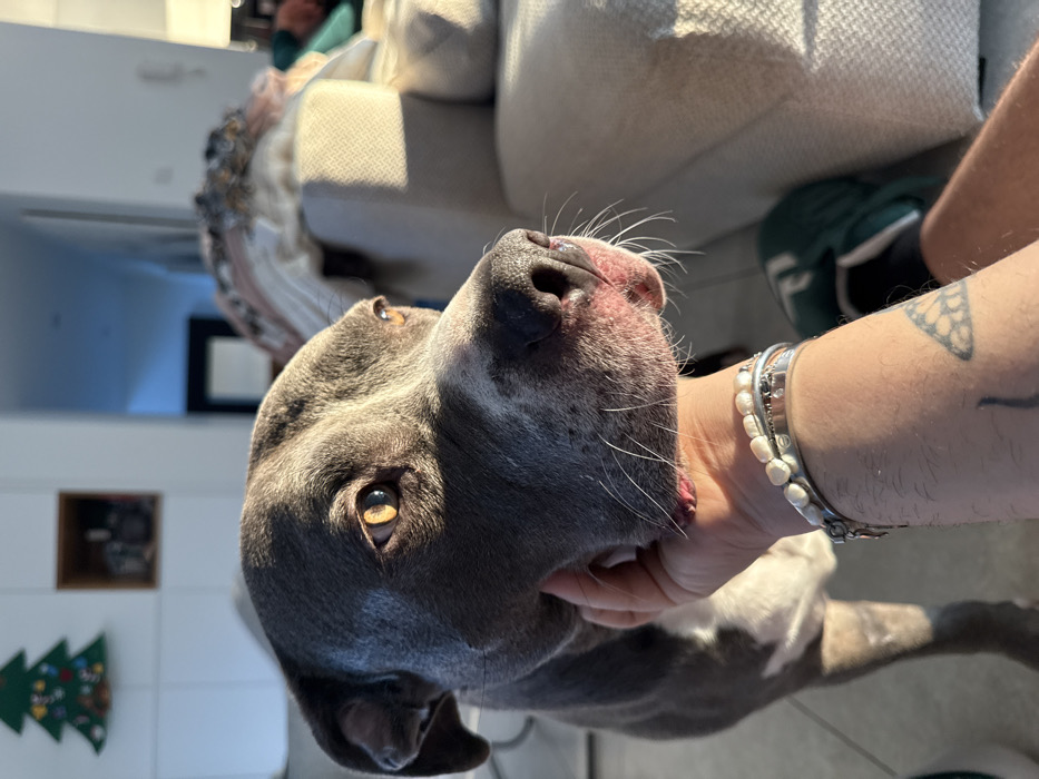 The image displays an indoor scene in Junglinster, Luxembourg, captured during a period of strong, warm natural light, likely morning or late afternoon. The primary subject is a gray-furred dog, appearing to be a Pit Bull type breed, positioned centrally and facing towards the viewer with its head slightly angled to the right. Its eyes are amber, reflecting the sunlight, and its nose and lower lip area are pinkish, with prominent whiskers. A human's right forearm and hand are featured in the lower-center of the frame, gently cupping or supporting the dog's chin and jaw. The forearm exhibits a tattoo resembling a stylized butterfly wing or geometric pattern and is adorned with multiple bracelets, including one composed of white pearls, a silver band, and a dark band. The background shows a domestic environment. To the right, a light-colored upholstered sofa or armchair is partially visible, with draped textiles or blankets on its surface. To the left, a white wall or built-in cabinetry features a green, ornamented Christmas tree decoration and a recessed square niche containing a dark, indistinct object. A brightly lit hallway or doorway with a dark frame, exhibiting a cool blueish light, is discernible in the distant background. The floor beneath the dog is light in color.