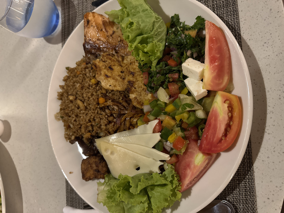 A plate of food features a diverse mix of ingredients. There's grilled chicken and fried rice, paired with what appears to be cheese slices and lettuce. A vibrant salad of diced tomatoes, bell peppers, and herbs sits beside slices of tomato and feta cheese. The plate offers a combination of protein, grains, and fresh vegetables. A glass of water is near the plate.