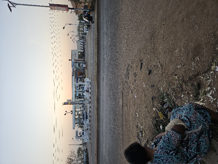 A person in a patterned blue dress lies on the ground amidst scattered debris. A road runs parallel to the person, with a gas station visible on the opposite side. The sky is a gradient of blue and orange, suggesting either sunrise or sunset. Streetlights line the road, and a distant pole stands tall against the skyline. The scene evokes a sense of neglect or vulnerability.