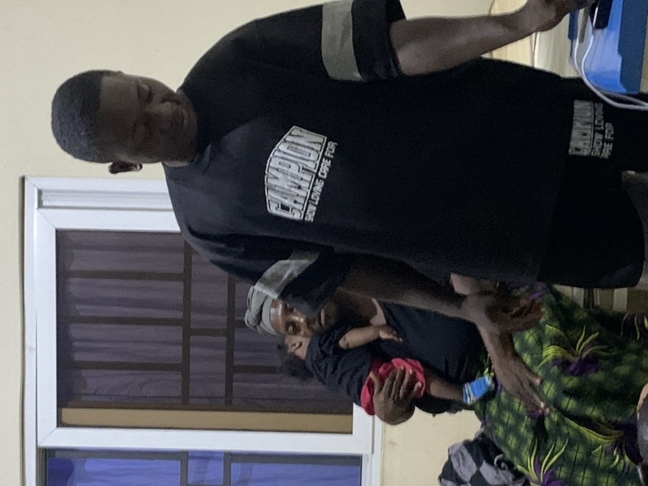 A man stands in the foreground wearing a black t-shirt with white lettering. Behind him, a woman wearing a head covering holds a small child. She is partially obscured, wearing a dark shirt and patterned green and purple fabric. A window with blinds is visible in the background. A blue object is on a nearby table. The image is somewhat dark and blurred.