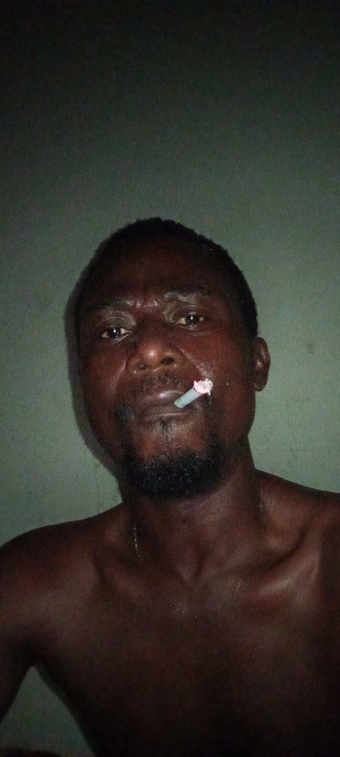 An unadorned photograph presents a shirtless, dark-skinned man with a short beard and a cigarette held between his lips. His expression is intense, with furrowed brows and a direct gaze. The setting appears to be indoors, indicated by a plain, somewhat faded wall in the background. The image is cropped closely, emphasizing the man's face and upper torso. Sweat or moisture glistens on his skin.