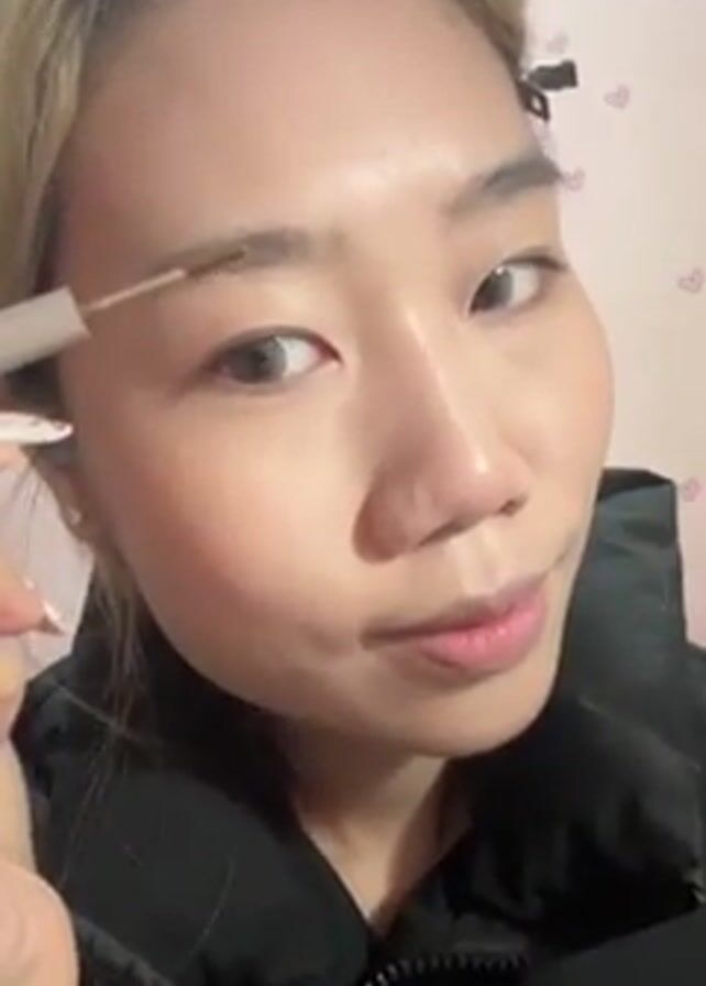 A person is applying makeup to their eyebrows. The person has light brown hair, light skin, and is wearing a black puffer jacket. The person is holding a makeup brush in their right hand and is using it to apply brown makeup to their right eyebrow. There is a pink wall with heart designs in the background. A hair clip is in the person’s hair.