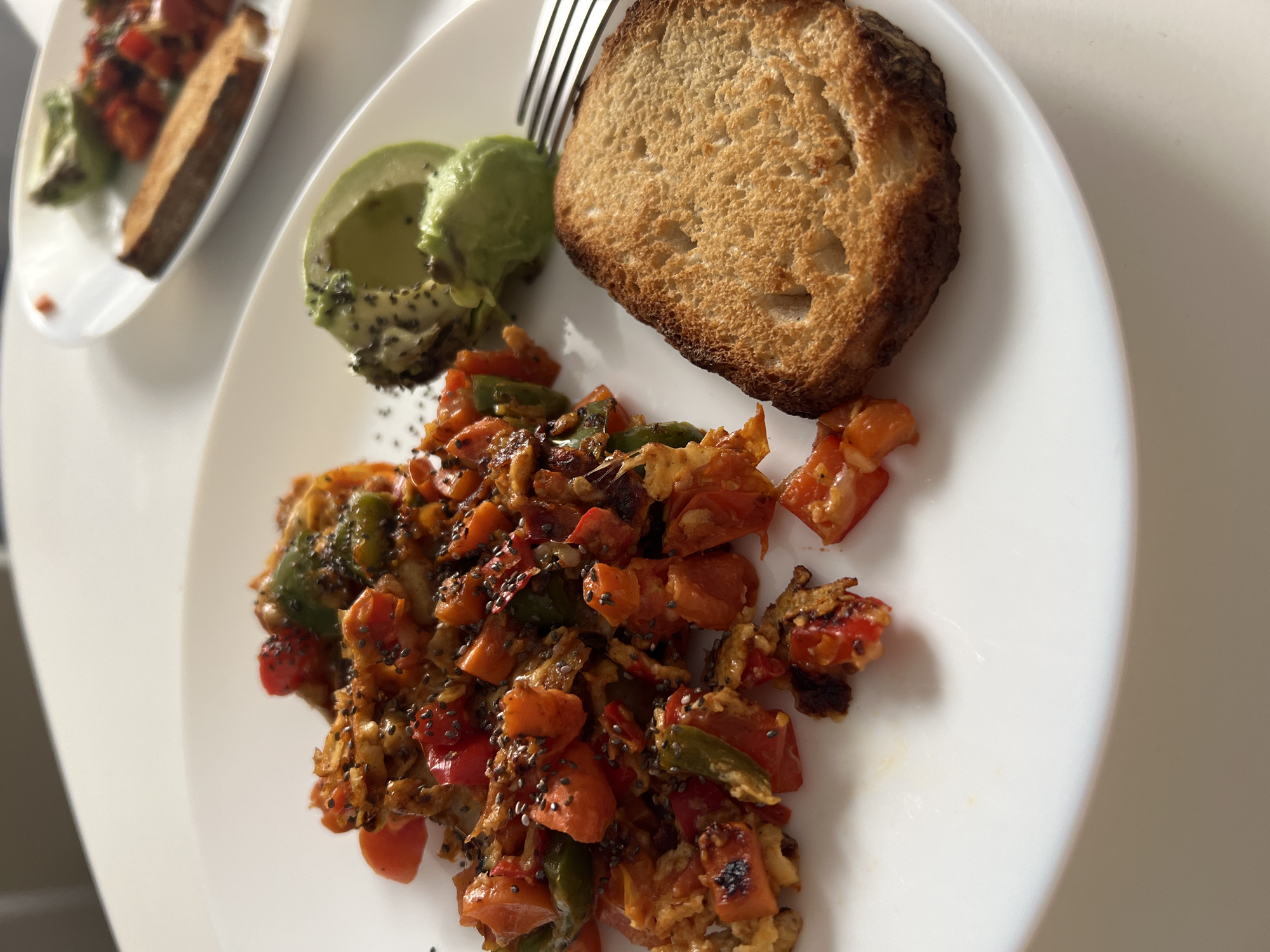 A plate of food sits on a white surface. The plate contains scrambled eggs with diced red and green peppers, avocado with chia seeds, and a slice of toasted bread. A fork is positioned next to the bread and avocado. Another plate with a similar meal is partially visible in the background.