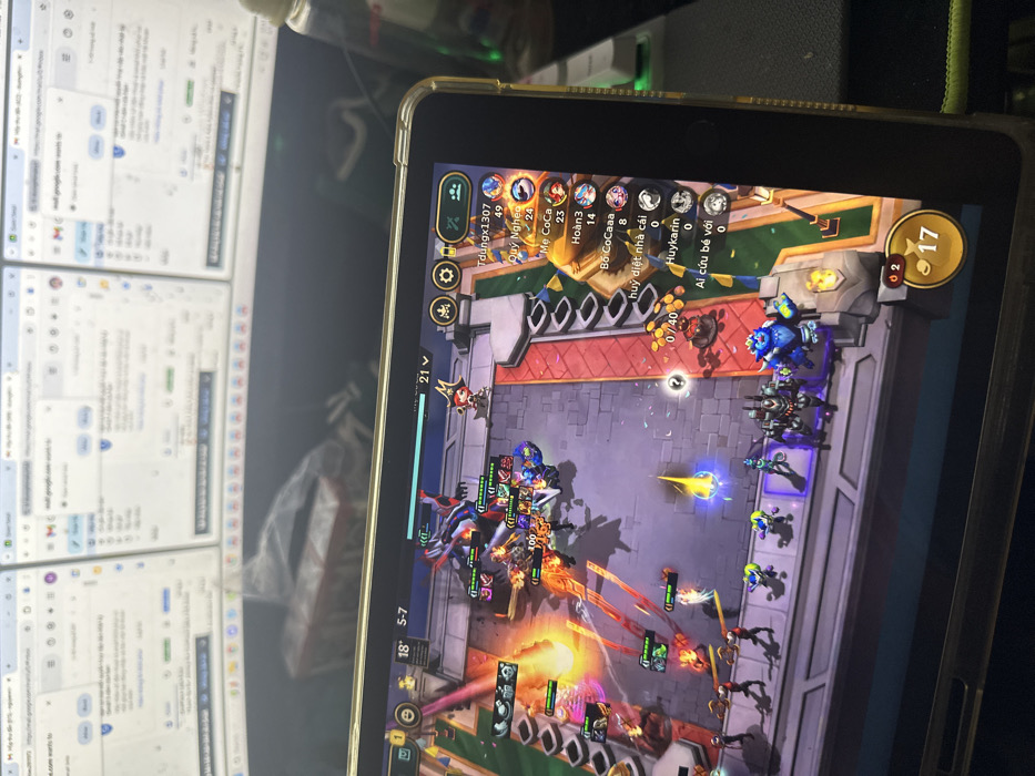 A person is playing a mobile game on a tablet device. The game appears to be a strategy game with various characters and objects in a virtual environment. The tablet is on a desk, with two computer monitors behind it. The game is in progress, with a countdown timer at the top. The game is in Vietnamese, with the names of the players visible on the right side of the screen. The tablet is resting on a green surface, with the top half of the screen visible. The tablet is tilted slightly to the left. The image appears to be taken in a dimly lit room. The coordinates (10.366, 107.1) place the image in Vũng Tàu, Vietnam.