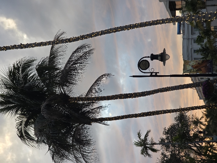 The image displays an urban twilight scene in Naples, United States of America. The sky above is largely overcast with gray clouds, exhibiting subtle orange and pink coloration consistent with either sunrise or sunset. Several tall palm trees dominate the mid-ground, their dark fronds silhouetted against the sky. The trunks of at least three prominent palm trees are wrapped with numerous illuminated white string lights. A black, ornate street lamp is positioned in the mid-ground, featuring a circular sign partially displaying the word "Naples" and an illuminated downward-facing glass globe fixture. In the background, multi-story buildings with light-colored facades are visible, one of which displays a large vertical banner or mural depicting a standing figure. No individuals or vehicles are present in the frame.