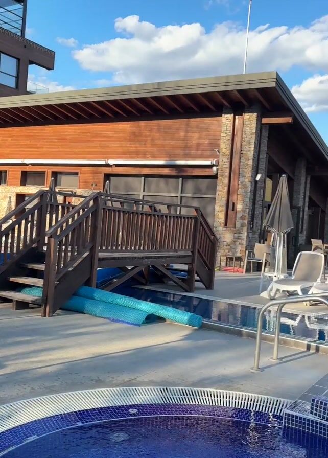 outdoor pool area of a hotel or resort on a clear, sunny day
