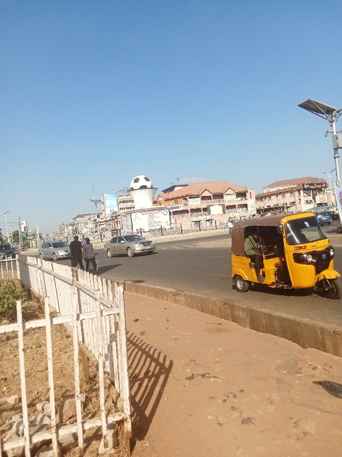 A bright, sunny day shows a street scene with a yellow auto rickshaw, known as a "keke," dominating the right side of the frame. A white metal fence runs along the left foreground, casting shadows on the ground. Cars are visible on the road, with pedestrians walking near the center. In the background, a building topped with a large soccer ball stands out amidst other structures. Utility poles and wires are also present, contributing to the urban landscape.