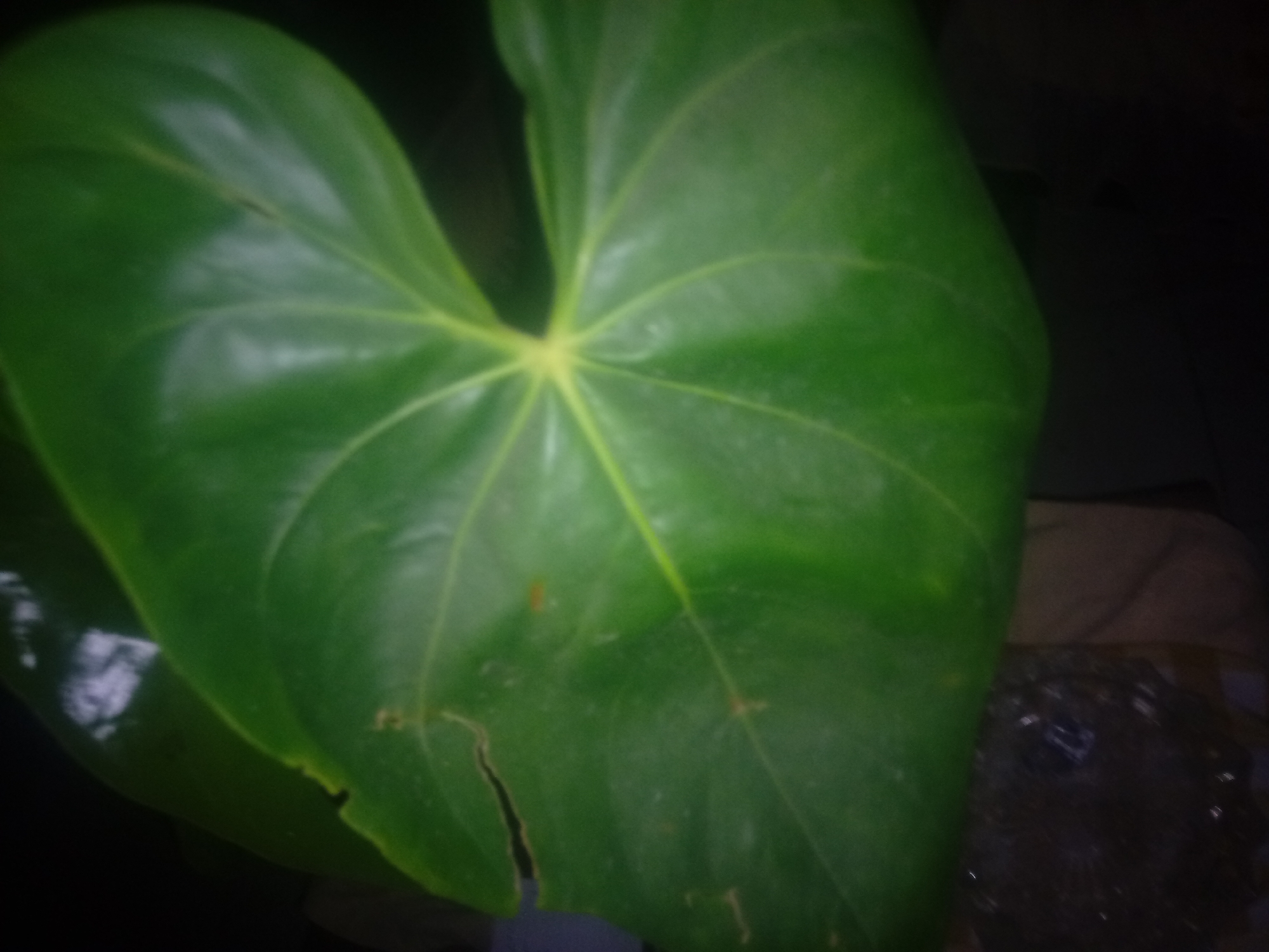 close-up of a large, glossy green leaf, possibly from a houseplant. The leaf has prominent veins radiating from a central point. There are some imperfections on the leaf, including small brown spots and a tear along the edge. The background is dark and blurry, suggesting a dimly lit indoor environment. A portion of what appears to be a crumpled plastic bag or container is visible in the lower right corner. The location, Juan Griego, Venezuela, is not directly discernible from the image. Therefore, the description is limited to the visible elements within the frame.