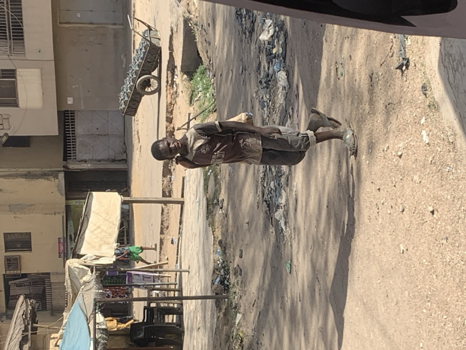 The image depicts an outdoor street scene in Sabon Gari East, Nigeria, under bright daylight