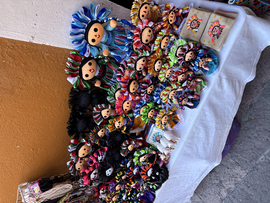 A collection of handmade Mexican dolls with colorful ribbon hair adorns a table