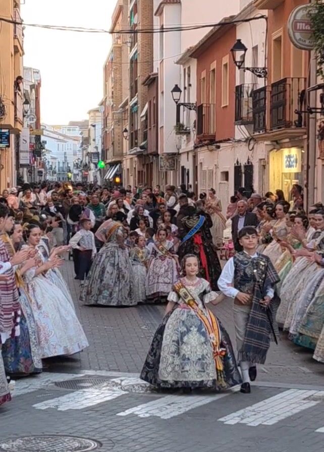 A large group of people, mostly women and girls, are lined up on a city street, many wearing traditional dresses. The dresses are ornate and patterned, in various colors, with some individuals also wearing sashes. A few men are present, also in formal attire. They are standing on a crosswalk and are facing away from the camera. Buildings line both sides of the street, and there's a street sign visible in the distance. A few people are raising their hands in what appears to be a wave or greeting. The overall scene suggests a parade or cultural event.