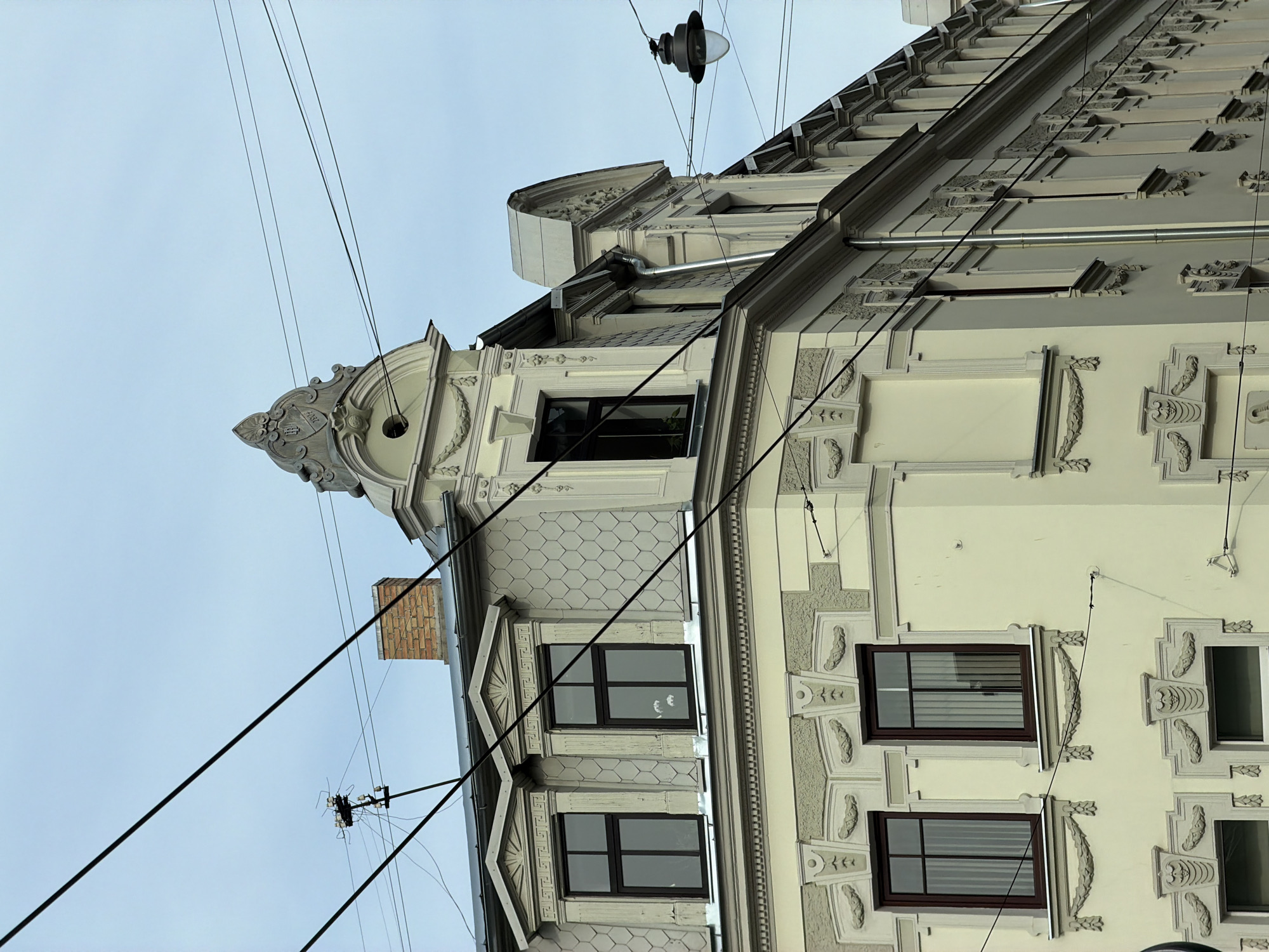 The image depicts a building facade in Riga, Latvia, characterized by ornate architectural details. The building has multiple windows, each framed with decorative moldings and carvings. The facade is painted in light colors, with contrasting gray accents that emphasize the architectural features. A chimney is visible on the left side of the building. Overhead power lines cross the frame, with a street lamp hanging from the wires at the top center. The sky is overcast.