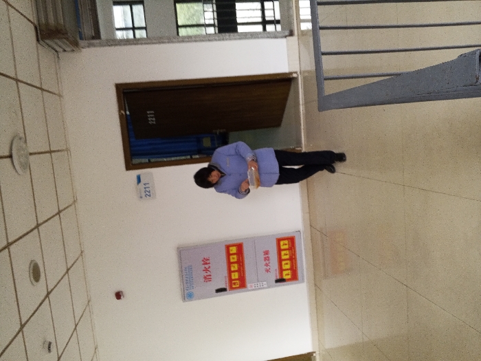 An overhead shot reveals a hallway scene. Tiled flooring and white walls are visible. On the wall, there's a door labeled "2211" and a fire equipment cabinet. A person in a blue jacket and black pants stands in the hallway, holding an object. Stairs with a gray railing are positioned on the right. Windows are located in the upper area of the picture.