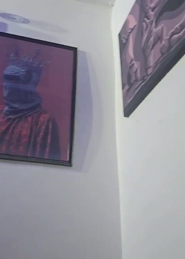 corner of a room with two framed pictures hanging on the walls. On the left wall is a framed picture depicting a person wearing a crown and a dark covering over their face, dressed in a red patterned garment, against a red background. On the right wall is a larger, rectangular framed picture in gray tones. It depicts a scene with a figure kneeling and reaching upward, a figure lying prone, and other objects rendered in a stylized manner. The walls are white, and a section of a ceiling with a recessed light is visible above. The camera pans up to provide a wider view of the picture on the right wall.