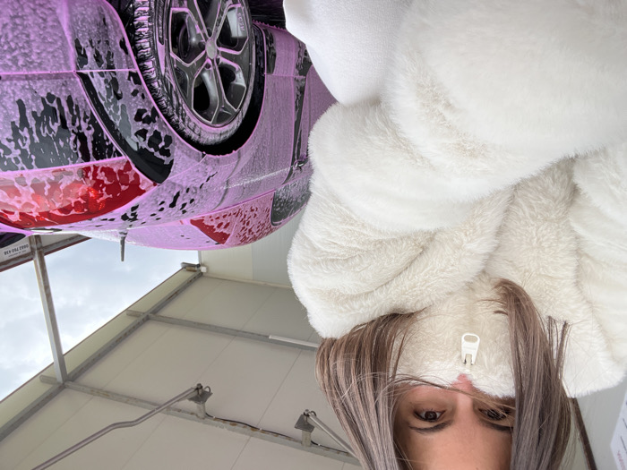 In the city of Bryastovo, Bulgaria, an outdoor car wash bay is depicted under an overcast sky. A female subject, with shoulder-length brown hair and brown eyes, occupies the left half of the frame, looking directly at the camera. She wears a cream-colored, high-collared faux fur jacket, zipped to conceal her mouth and nose, revealing only her eyes and forehead. Her arms are bent at the elbows, holding the jacket around her. To the right, a dark-colored sports car is visible, covered entirely in vibrant pink foam, indicating an active washing process. The car's rear quarter panel, a multi-spoke wheel, and a portion of its roof are discernible through the foam. The car wash structure features a white panel ceiling supported by grey metal beams. In the distant background, to the far right, a building wall with a partially visible sign displaying the phone number "0882 750 436" can be observed.