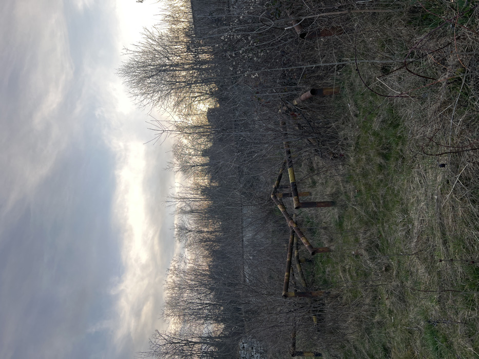 The image depicts an unmaintained outdoor area in Ardino, Bulgaria, under an overcast sky at dusk or dawn. The foreground consists of sparse green grass interspersed with dry, brown weeds and leafless shrubbery. Centrally located in the foreground and extending into the midground is a severely rusted metal barrier composed of cylindrical pipes, exhibiting alternating segments of faded yellow and brown/rust coloration. This barrier appears partially collapsed or dismantled, forming angular, broken shapes. Behind this structure, the midground features dense, bare deciduous trees and shrubs, through which a light-colored wall or building is partially visible. The background is dominated by a dense line of leafless trees silhouetted against a cloudy sky. The sky displays a central bright, diffused yellowish-white glow, suggesting a low sun, transitioning to darker grey clouds towards the top and edges of the frame. No individuals, actions, or specific interactions are present in the scene.
