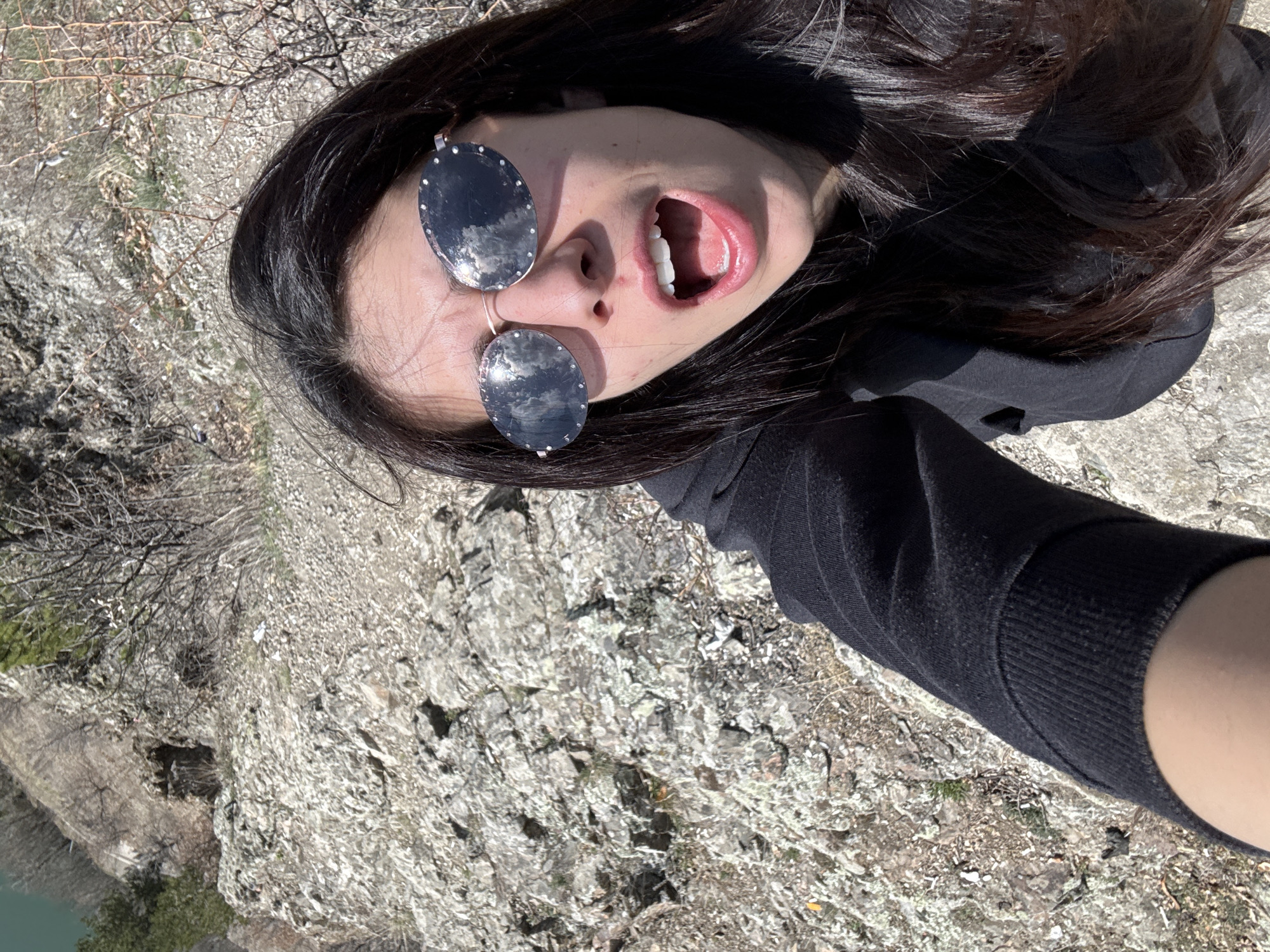A forensic examination of the image reveals a close-up selfie of a single individual, a female with long dark hair, positioned on a rocky cliffside in Pancharevo, Bulgaria. She is wearing dark, oval-shaped sunglasses adorned with small, reflective studs, and a dark, long-sleeved garment. Her mouth is wide open, suggesting a gasp, shout, or expression of surprise. The immediate foreground and midground consist of rough, greyish rock formations, gravel, and sparse, dry vegetation, including thorny bushes and bare tree branches indicative of a dry climate or early spring. In the upper left quadrant of the background, a body of greenish-blue water is visible at a significantly lower elevation, indicating a lake or river below the steep cliff. The scene is brightly illuminated by direct sunlight, with clear reflections of a bright sky visible on the sunglass lenses. The overall impression is one of a person taking a selfie on a high, exposed rocky outcrop overlooking a body of water.