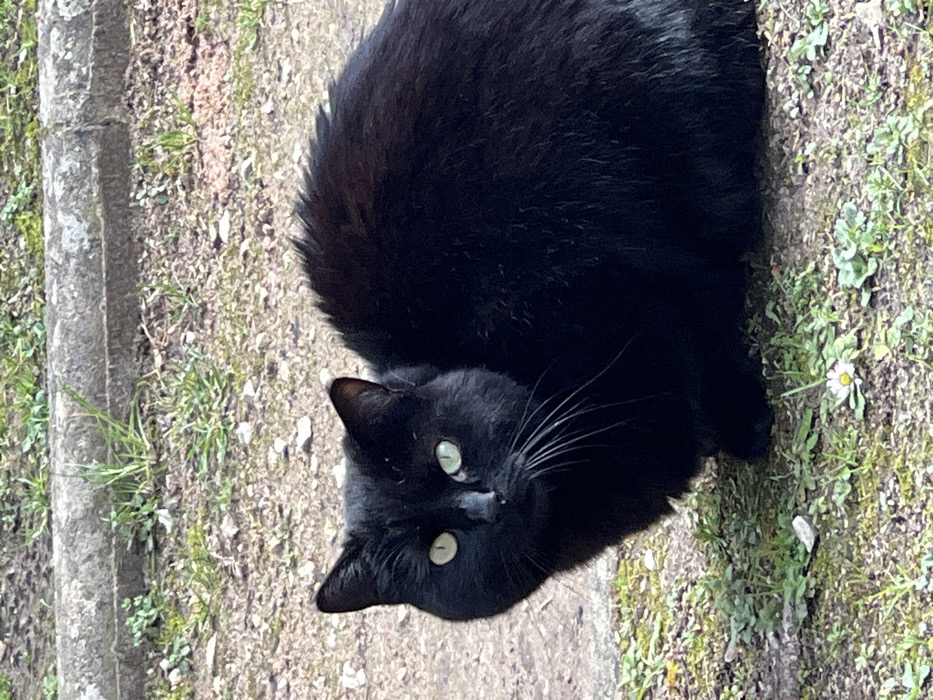 - "Located in the city of Plaisir, France, this image displays a black cat situated in a low, seated or crouching posture on a patch of ground" by FM-ltjrj1, licensed under CC BY 4.0