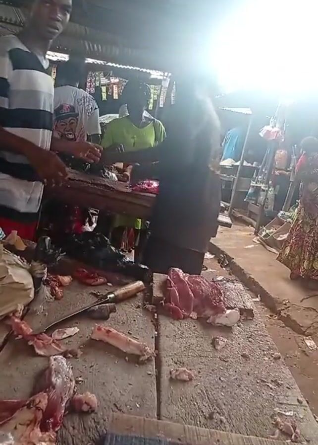 The scene is a bustling outdoor market. A man in a striped shirt is cutting up raw meat on a large wooden table. The table is covered in meat scraps and bones. Another man wearing a jersey stands behind him. A woman in a green dress stands behind the second man. Other people mill about in the background. The market area is covered by a roof with sunlight streaming through. The ground appears to be dirt and gravel.
