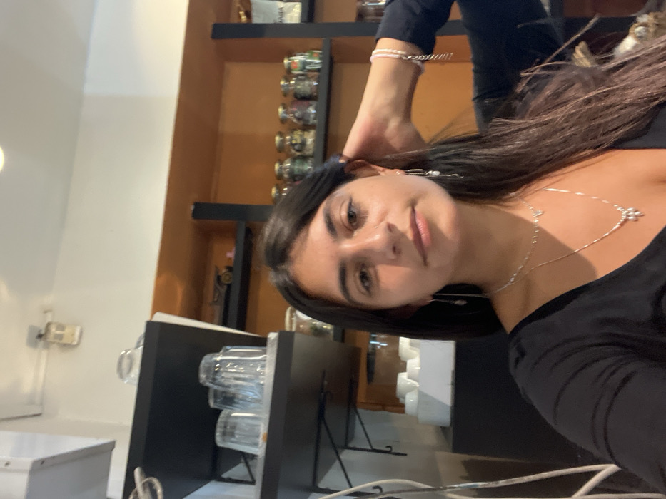 A young adult female with long, dark hair is depicted indoors within a commercial establishment in Ramat Gan, Israel