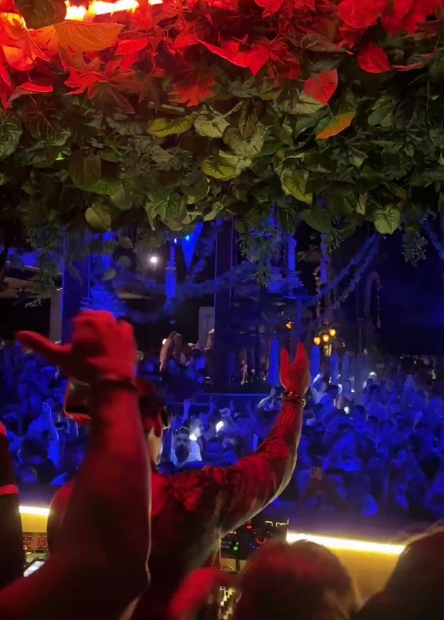 From a low angle, the video shows a large crowd of people, mostly young adults, partying under a canopy of dense green foliage with interspersed red and white lighting. The canopy hangs from the ceiling of what seems to be an open-air club or event space. In the foreground, a person is partially visible, wearing a red shirt and raising their arms in the air along with the crowd. Another individual stands slightly ahead, facing the crowd, possibly a DJ or performer, also with their hands raised. Many people in the crowd are holding up phones, likely recording the event. The overall atmosphere is festive and energetic, with a high-energy vibe created by the music and crowd interaction.