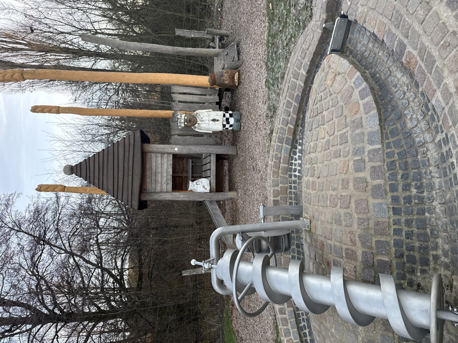 This image depicts an outdoor play area in Olingen, Luxembourg, characterized by an agricultural or milling theme