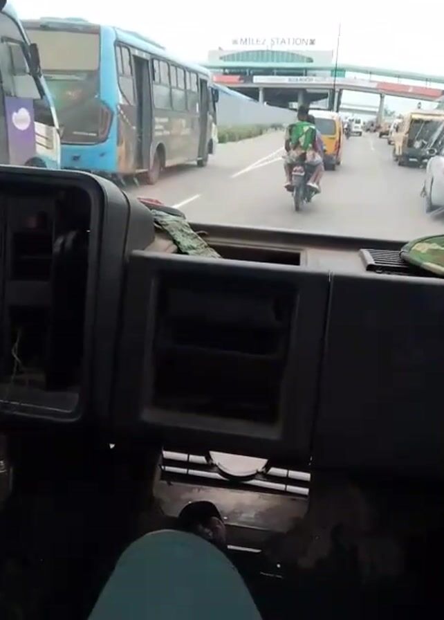 The video is shot from the interior of a truck or large vehicle, looking out through the front windshield. The vehicle is on a road, and traffic is visible. In the distance, a pedestrian overpass with the sign "MILE2 STATION" is visible. There are other vehicles, including buses and yellow minibuses, on the road. A motorcycle carrying two people passes by. The dashboard of the truck is in view, and the person taking the video is sitting in the driver's seat.