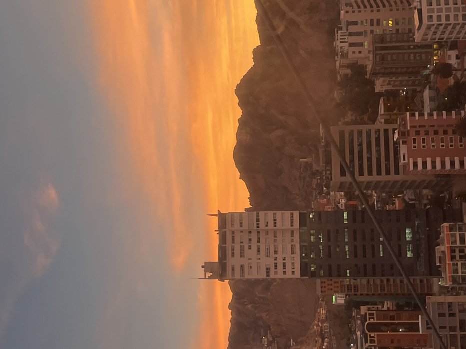 A dramatic cityscape at sunset. Tall buildings stand silhouetted against a bright orange sky. A large mountain rises in the background, its contours highlighted by the fading light. The sky is a gradient of blue and orange, with some clouds. Powerlines cut across the scene, adding to the urban feel. Lights twinkle in the buildings, signaling the onset of evening.