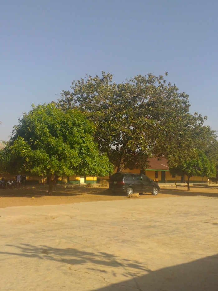 This image depicts an outdoor daytime scene in the city of Unknown, Unknown, characterized by bright sunlight and a clear blue sky. The foreground and midground feature a light-colored, cracked, paved surface exhibiting distinct shadows cast by trees. Three prominent trees are visible: a dense, vibrant green-leafed tree on the far left, a larger tree with darker green foliage in the center, and a smaller tree with similar foliage on the right. A dark-colored minivan or SUV is parked beneath the central tree, oriented slightly towards the right, with a small, light-colored object situated near its front passenger wheel. In the background, a single-story building with light-colored walls, a green horizontal stripe or trim, and a reddish-brown roof spans horizontally. A group of approximately 4-6 individuals, dressed in light-colored attire, are gathered or seated on the ground beneath the leftmost tree, adjacent to the building. No specific actions or interactions among these individuals are clearly discernible.