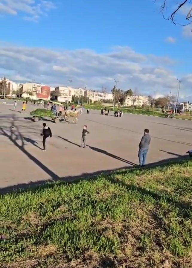 public square on a sunny day with a few clouds. A horse is pulling a cart filled with green vegetation. A man is driving the cart. Several people are walking around and observing. The ground is paved with a dark grey surface, with grassy areas bordering the square. Buildings are visible in the background.