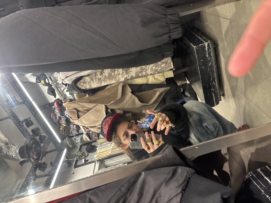 The scene is captured within a retail establishment, likely a streetwear or fashion store, situated in the city of Strasbourg, France. The image is a mirror selfie, reflecting a young individual crouched or squatting. The person is holding a silver smartphone in their left hand, angled towards the mirror to take the photograph. They are wearing a backward red and black "CHICAGO" baseball cap, a dark, textured long-sleeved garment, light blue jeans, and a blue bandana around their neck. Both hands are heavily adorned with multiple large, gold-colored rings, some featuring prominent red stones; the right hand is slightly raised with fingers splayed, showcasing these rings. The background, visible in the mirror's reflection, displays merchandise characteristic of a clothing and accessory store. A wall-mounted rack holds numerous baseball caps and beanies. Clothing racks are visible, featuring various garments including a beige/tan coat, a camouflage-patterned jacket, and dark outerwear. Gold-colored chains are also displayed. The ceiling exhibits exposed ductwork covered in silver foil, accompanied by fluorescent strip lighting and track light fixtures. The floor is light-colored, and a dark, worn display stand base with visible scuffs is on the ground. A blurry, out-of-focus finger is partially visible in the lower right portion of the mirror's reflection.