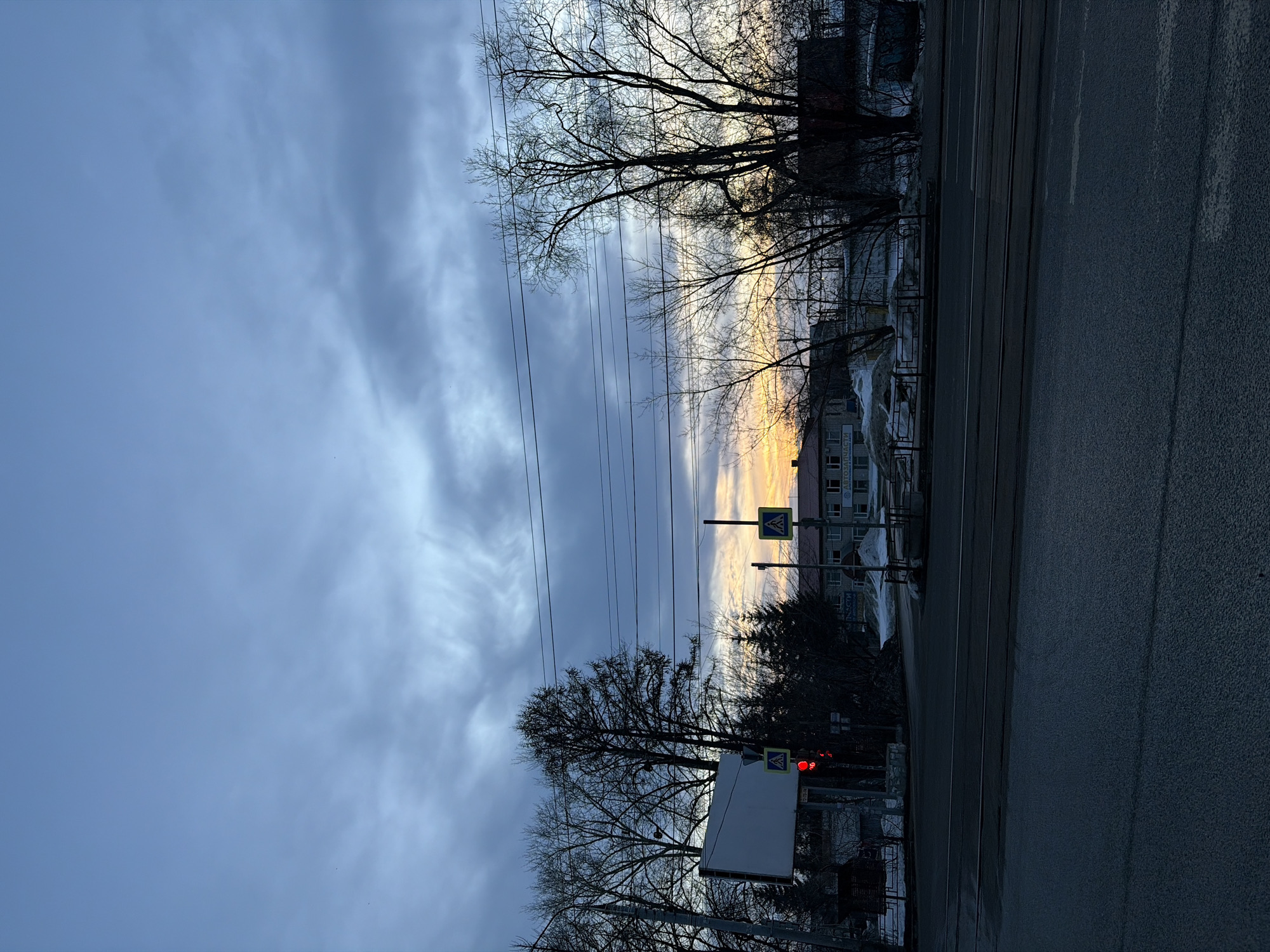 The image depicts an urban street scene in Izhevsk, Russia, at twilight. The sky occupies the upper two-thirds of the frame, transitioning from a dark blue-grey overcast tone at the top to a lighter blue with a distinct orange and yellow glow on the horizon, prominent on the right side. In the foreground, a dark asphalt road runs horizontally, bisected by two parallel tram tracks. The midground features a combination of urban infrastructure and natural elements. On the left, a large, blank rectangular white sign is mounted on a pole, below which a traffic light displays a solid red signal. Adjacent to the traffic light, a yellow square sign with a black pedestrian symbol indicates a pedestrian crossing. A second identical pedestrian crossing sign is visible further right, closer to the horizon. Bare deciduous trees with intricate branch networks and several dark green coniferous trees are interspersed across the midground, some silhouetted against the lighter sky. Overhead utility lines stretch horizontally across the frame. Piles of snow are visible on the ground along the roadside, particularly on the right, and next to a multi-story building. This building, located in the mid-right, is light-colored and features multiple windows, with a prominent sign on its facade reading "АВТОЗАПЧАСТИ" (Car Parts). No individuals are present in the depicted scene.
