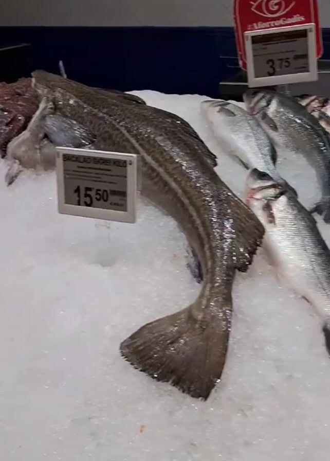 The camera pans across a fish market display of various fish laying on a bed of ice. Prices are posted next to the different types of fish. The types of fish include cod, sea bass, gurnard, flounder, and other fish filets.