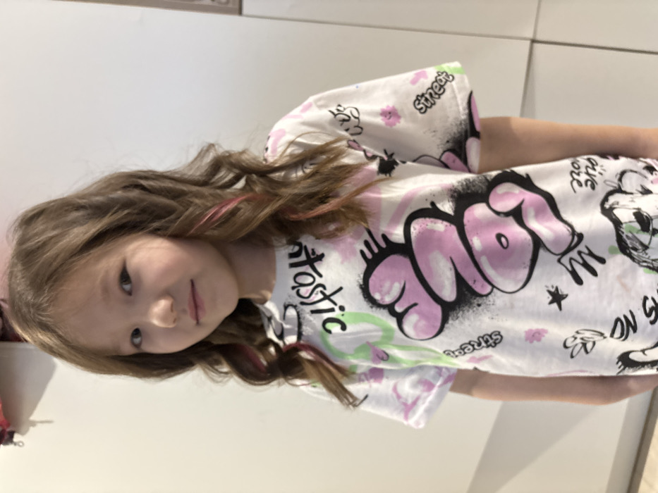 A young female, estimated to be between 5 and 10 years old, is depicted in a chest-up, frontal portrait. She possesses medium-brown, shoulder-length curly hair, notably featuring several distinct pink streaks primarily visible on the right side of her head (viewer's left). Her facial features include fair skin, dark eyes, a small nose, and a slightly upturned mouth, conveying a subtle smile. She is looking directly towards the camera. The subject is wearing a white, short-sleeved t-shirt covered in a graffiti-style pattern. This pattern includes prominent pink bubble letters with black outlines, green text (partially visible as "tastic"), smaller black text such as "street," and various abstract motifs like black stars and pink smudges. The background is a plain, light-colored surface, appearing to be an interior wall or a large piece of furniture, possibly a cabinet, given a vertical seam visible on the far right. A faint, small red object is discernible in the upper left background. The lighting is even, suggesting an indoor environment. The scene is understood to be located in the city of Chaikovsky, Russia.