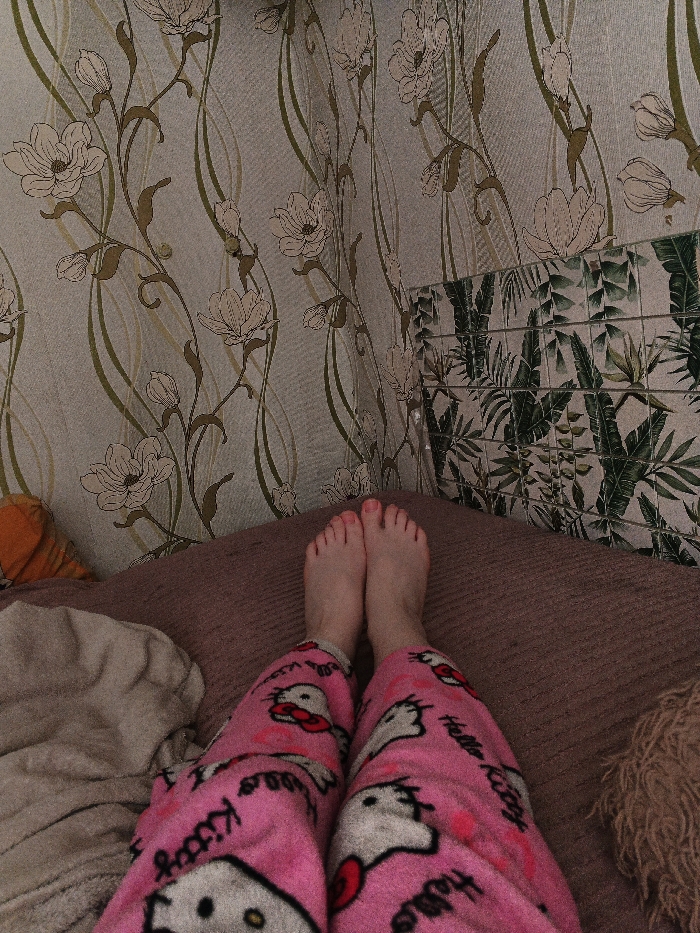 An indoor scene, observed from a first-person perspective, depicts a person's bare feet with pink-painted toenails, resting on a textured, dark taupe fabric surface. The lower legs are clad in pink fleece pajama pants patterned with white "Hello Kitty" characters and text. A light beige fabric is partially visible to the left, and a shaggy brown textile object is to the right. The walls in the background feature two distinct wallpaper patterns meeting in a corner: one with large, light-colored flowers and green-brown vines on a light background, and another section with a tropical leaf pattern in various shades of green. This interior is located in the city of Chaikovsky, Russia.