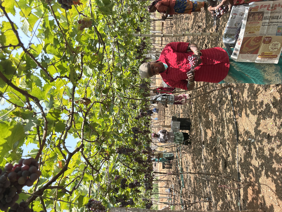 The image displays an active grape vineyard in Chinnalapatti, India, under bright daylight