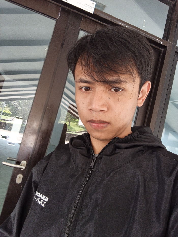 A close-up, front-facing image captures a young male subject with dark hair and a neutral expression, located indoors against a glass door or window in Cimacan, Indonesia