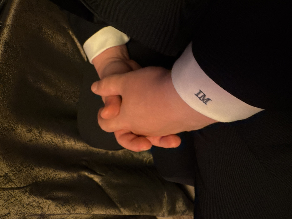 A close-up shot showcases two hands, clasped together. The person on the right wears a dark suit jacket with a crisp white cuff visible, adorned with the initials "IM" in a dark font. The other hand is also fair-skinned. The texture of a dark, possibly velvet, material is seen in the bottom left corner of the image. The lighting is subdued.