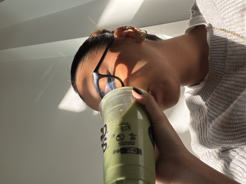 A person is depicted in an indoor setting, observed from the mid-chest upwards. The subject, appearing to be female with dark hair pulled back, is wearing black-rimmed glasses, a light grey ribbed knit sweater over a white collar, and a gold chain necklace. Her left ear is adorned with gold hoop earrings and a helix piercing. She is actively drinking from a clear plastic bottle containing a green liquid, possibly a beverage, which she holds with her left hand; black nail polish is visible on her thumb. The bottle features text, including "EN PLASTIQUE," indicating a French-speaking context. Strong sunlight illuminates the scene from the upper right, casting sharp shadows across her face and the plain, light-colored wall in the background. The specific location within Paris, France, cannot be determined from the visual information provided.