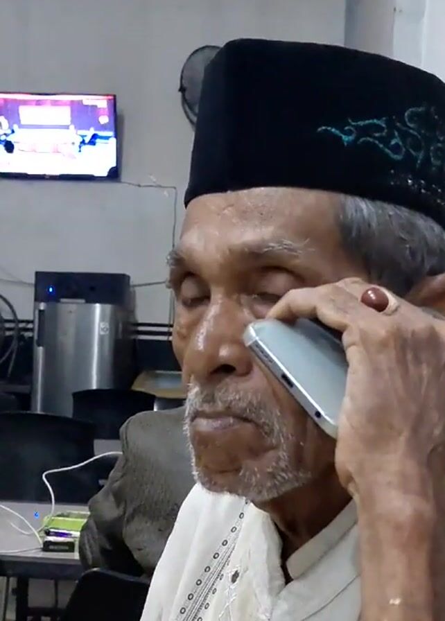 A man of advanced age is on a phone call. He wears a black peci hat with green embroidery and a light-colored shirt with embroidered details. He holds a silver-colored smartphone to his right ear. A red ring is visible on his right hand. He has gray hair and a mustache. The setting appears to be an indoor area, possibly a cafe or waiting room. In the background, a television displays an image, a water dispenser, and other individuals seated at a table. One person is partially visible to the left of the main subject. The room has tiled walls, and there is a fan nearby.