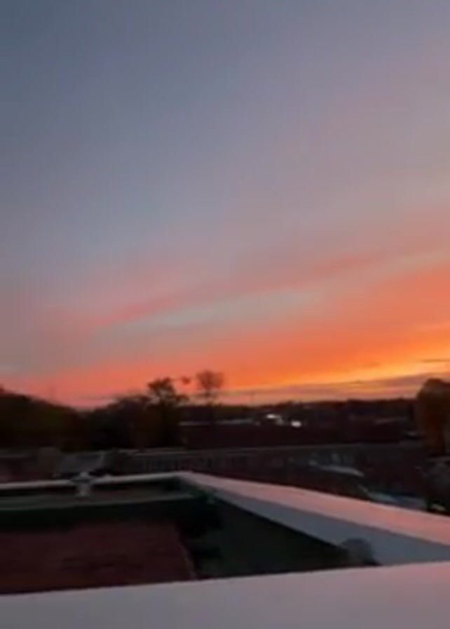 view of a cityscape from a rooftop. The sky transitions from orange and pink near the horizon to a soft blue above. Buildings and trees are visible in the distance. The rooftop itself has white surfaces and some visible structures and seating. The camera slowly pans around the area, showing the urban landscape and the changing colors of the sky.