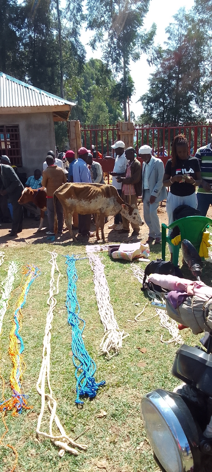 scene in Kakunga, Kenya (latitude: 0.374, longitude: 34.855) with a group of people standing and talking in front of a building. There are several cows in the foreground, including a brown and white cow. The people are all wearing casual clothing and appear to be engaged in conversation. There are several bundles of rope laid out on the ground in front of them. There is a motorcycle parked in the lower right-hand corner of the image. The building in the background is a simple, one-story structure with a corrugated metal roof. The scene appears to be a market or an informal gathering place. The environment is rural with trees and green grass. There is a red metal fence in the background. The ground is dirt with some grass growing on it. There are multiple people in the image, all dressed in casual clothes, and some wearing hats. They appear to be in a social or business setting.