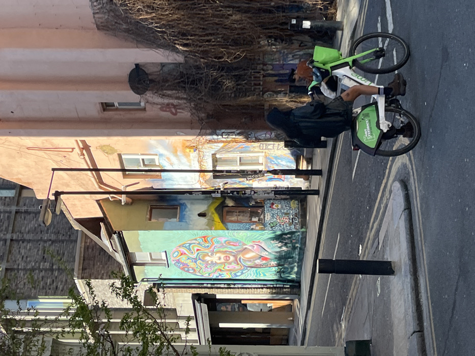 The image depicts a street scene on Rivington Street in Shoreditch, London, United Kingdom, under bright daylight casting strong shadows. In the foreground, an individual with long, dark hair, wearing a dark jacket, dark shorts, and brown shoes with white socks, is seen from behind riding a bright green and white Lime electric bicycle. The bicycle features a green front basket and displays "Lime" branding with "HAVE FEEDBACK?" text on its rear fender. The background features a row of buildings. To the center-left, a two-story building, painted in light teal and green, exhibits a large, vibrant mural of a woman's face with swirling, colorful hair and a bare shoulder. This building has two rectangular windows on its upper floor and a smaller, arched window with a wooden frame on the ground floor, beneath which additional graffiti is visible. Adjacent to this, on the right, stands a two-story building painted in a faded light peach-pink hue, featuring several rectangular windows. The right side of this building is extensively covered by tangled, dried vines or roots, with a black satellite dish mounted near its upper portion. Further right, a second individual wearing an orange top is partially visible behind the bike rider, obscured by the vines. A black street lamp pole stands between the teal and pink buildings. The asphalt road in the foreground features clear white road markings and a double yellow line along the curb, indicating parking restrictions. A black bollard is present on the sidewalk to the left, and a partially visible black and white bollard is on the right. Additional buildings, some with modern aesthetics, are visible further down the street in the background.