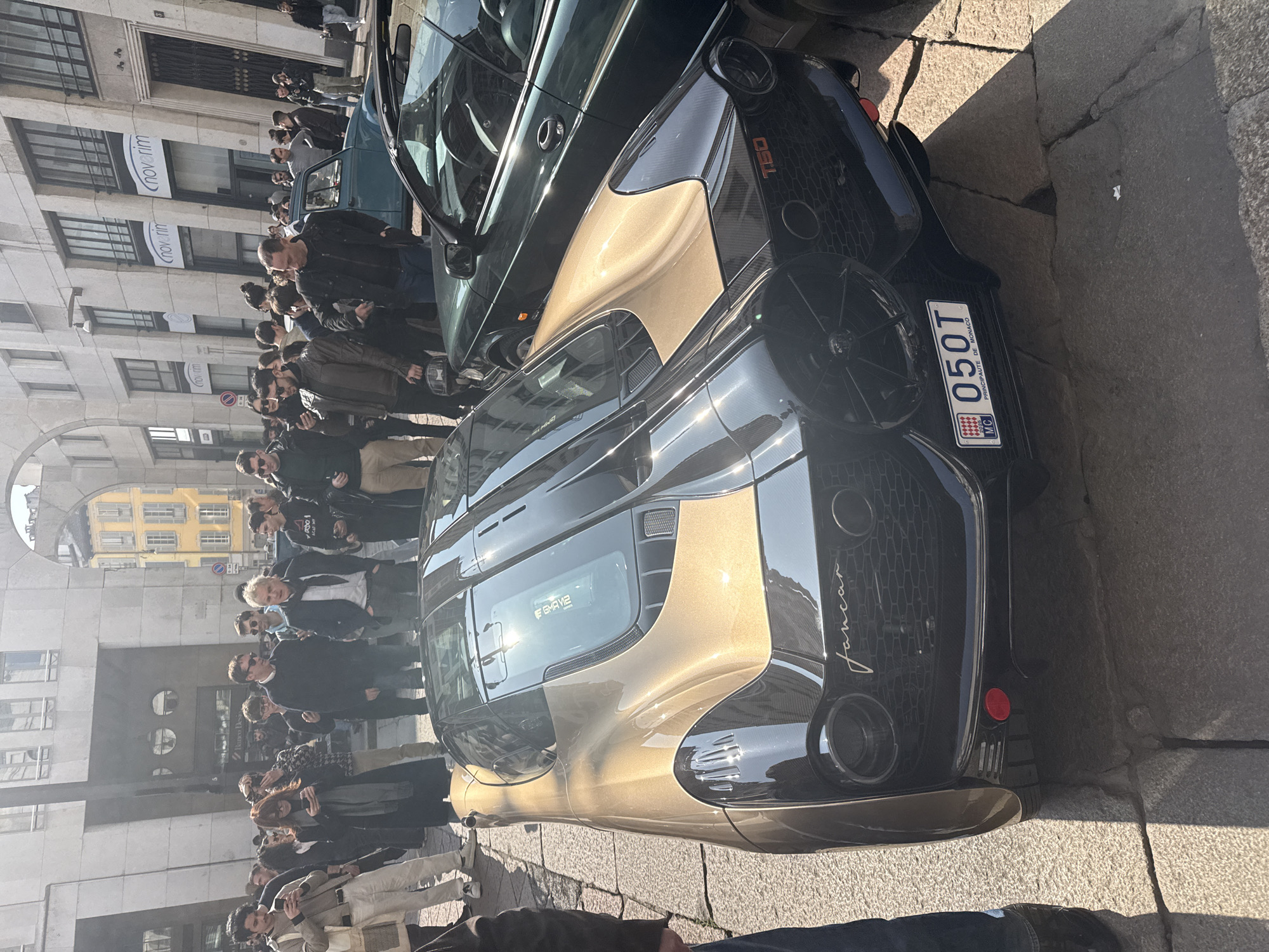 The image depicts a Gordon Murray T.50 supercar, distinguished by its metallic gold body and black carbon fiber accents, parked on a stone-paved street in a high-end commercial district of central Milan, Italy. The car, with a Monaco license plate "MC 050T," is viewed from the rear, showcasing its distinctive aerodynamic design, large circular tail lights, and "fancar" branding. To its immediate right, a dark green convertible, likely a Saab model, is parked. Further in the background, a light blue vintage car, possibly a Citroën 2CV, is partially visible. A crowd of approximately 30-40 individuals, predominantly adults in casual to smart-casual attire, surrounds the vehicles, primarily focusing on the T.50. Many individuals are holding smartphones, appearing to photograph or record the event. The scene is set under bright daylight, casting clear shadows. The background consists of multi-story, classic Milanese architectural buildings. One prominent building features a large arched passage and visible signage for "Banco Desio" and "Noverim." The street surface is composed of large, irregularly shaped stone blocks. The overall environment suggests a public display or gathering in a bustling urban setting, consistent with areas such as Via Alessandro Manzoni or Via Monte Napoleone.