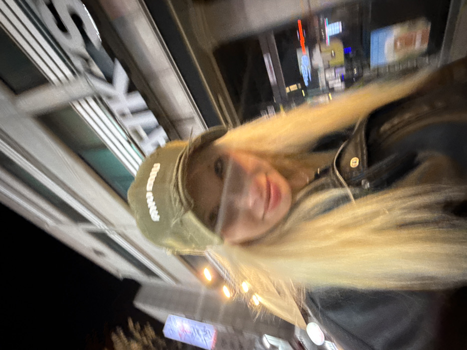 A blurry, low-angle photograph captures an individual in the foreground within an urban environment identified as Namyangju-si, South Korea, at night. The subject, a person with long, straight blonde hair, is wearing an olive green baseball cap with "miu miu" text embroidered in white, and a dark, possibly black, leather-style jacket with a visible zipper and a silver-toned button on the upper left chest. The subject's face is partially obscured by the cap's brim and horizontal motion blur, revealing light-colored eyes and a slight smile. The background features a multi-story building with a light-colored facade, displaying a large illuminated sign with partially visible white English characters (e.g., "TIKS") and Korean text. To the far left, a tall, vertical illuminated sign with blue and red elements and Korean script is visible. Further to the right, a blurred illuminated display shows what appears to be a graphic of a beer glass. The scene is illuminated by artificial light sources from streetlights and building signage.